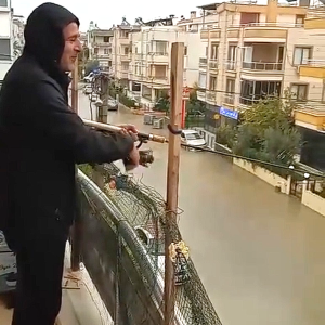 Amatör balıkçı olduğu öğrenilen bu kişi, evinin balkonundan sularla kaplı sokağa doğru oltasını sallayarak ‘balık tutmaya’ çalıştı.